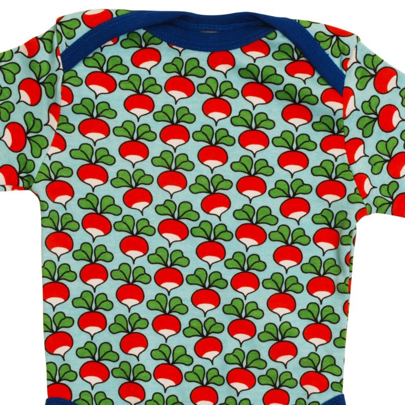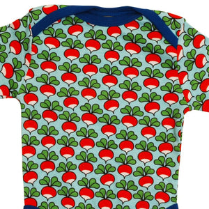 Funky baby/toddler long sleeve bodysuit with the classic radish print from sustainable Scandinavian label DUNS Sweden.
