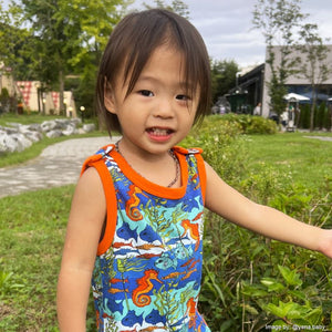 -Colourful ocean-themed print with fish, seahorses and kelp set on a blue seawater background with contrasting orange trim.