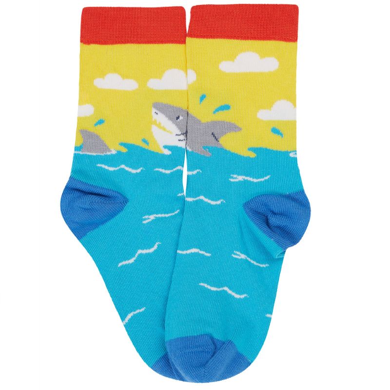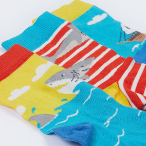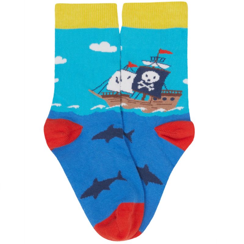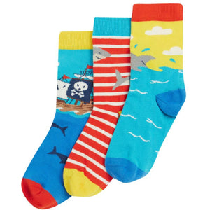 A 3-Pack of colourful pirate and ocean-themed socks for children from UK organic label Frugi. Made from organic cotton with contrasting toes and heels.