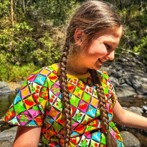 Eye-catching kids t-shirt with a variety of fruits and veggies in a harlequin diamond pattern from sustainable scandi label DUNS Sweden.