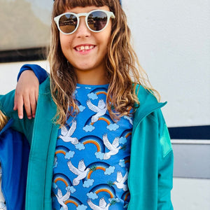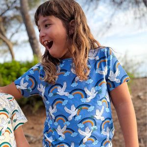 Eye-catching t-shirt for boys and girls with doves and rainbows from organic Swedish children's label Villervalla.