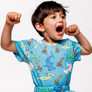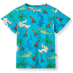 Colourful children's t-shirt with hammerhead sharks and squid from organic Danish label Smafolk.