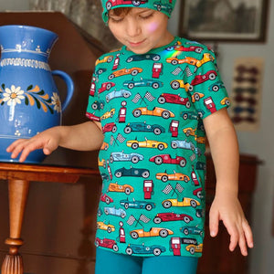 Colourful car-themed t-shirt for boys and girls with race cars, flags and petrol pumps from sustainable Swedish kids label Villervalla.