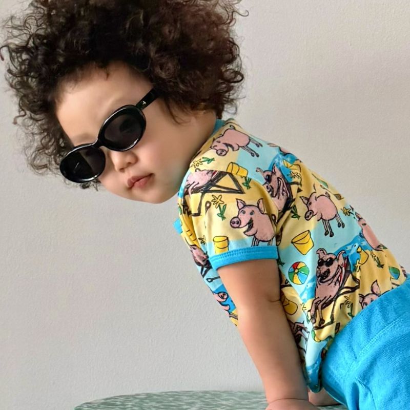 Colourful and quirky t-shirt for boys and girls with pigs at the beach from sustainable Scandinavian label DUNS Sweden.