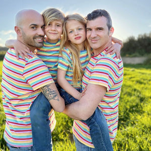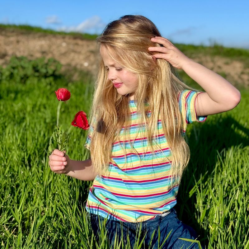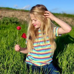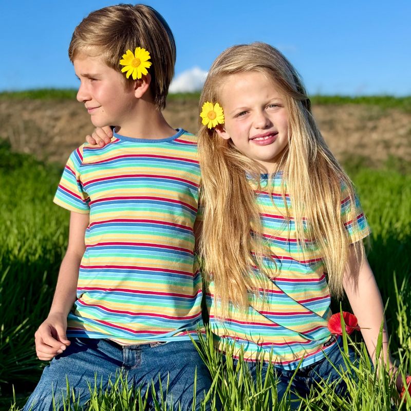 Colourful striped t-shirt for boys and girls in the 'Nautic' colourway from organic Swedish kids label Villervalla.